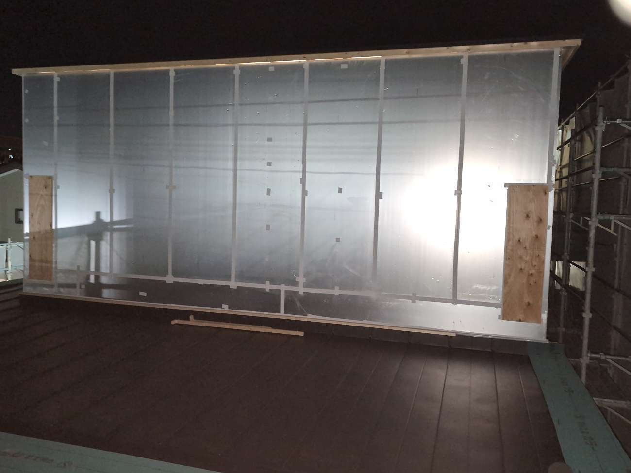 この状態にゴム系の両面防水テープを貼り、全面防水シートを施工します。